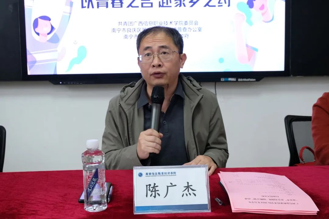 校团委 冯颖报道 1月15日,我校在1号实训楼102教室举行了大学生“返家乡”社会实践暨“扬帆计划”活动启动仪式 。校长助理陈广杰、校团委书记洪姣龙,南宁市良庆区统计局副局长、南宁市良庆区第五次全国经济普查办公室常务副主任张冰,南宁市良庆区良庆镇副镇长李增论出席会议,学校团委干事、全体实习学生以及学生代表参加本次会议。