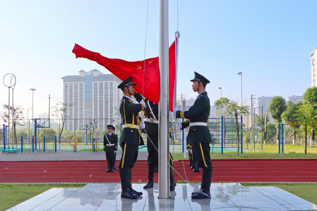 迎着朝阳,护旗手们着装整齐、步伐矫健地护卫着鲜艳的五星红旗入场,迈向旗台。伴随着《义勇军进行曲》的奏响,五星红旗冉冉升起,迎风飘扬。全体师生齐声高唱国歌、行注目礼。