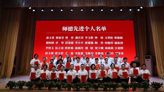 大会在雄壮的国歌声中拉开帷幕。大会对广西开放大学体系中获得优秀教师、先进教育工作者、师德先进个人、最美辅导员进行了表彰。大会通过视频播放、薪火相传仪式、诵读《师德铭》等环节,展现了我校教职工在育人方法探索、引领学生成长、师道精神传承等方面的生动实践。