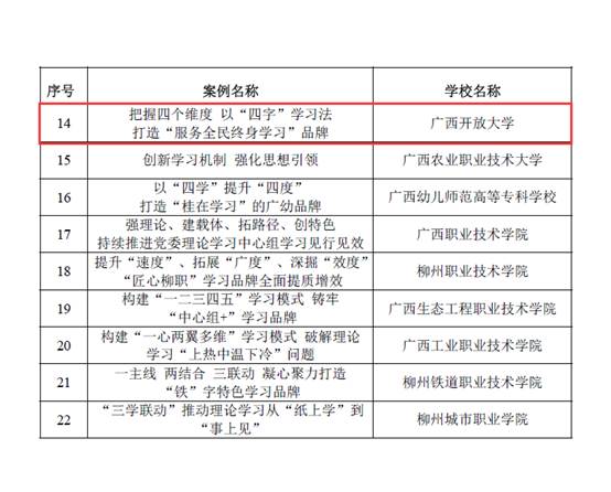 下一步,学校党委将以入选2023年度广西高校党委理论学习中心组优秀学习品牌为契机,大力实施学历教育创优提质、学习型社会能力提升工程,主动融入和服务新发展格局,为建设中国特色社会主义壮美广西、建设学习型社会作出贡献。