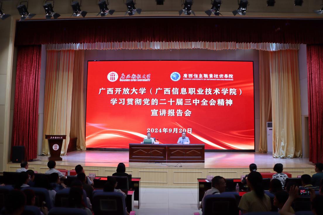 党委宣传部 报道 9月20日, 学校在东宝校区一楼报告厅举行学习贯彻党的二十届三中全会精神宣讲报告会。广西职业师范学院党委书记周鸿应邀作宣讲报告,学校领导王兴辉、黄美娟、龙雪津、黄鹄、李敏智,党委委员陈雪松、胡峥嵘,广西信息职业技术学院副院长陈广杰以及学校全体教职工参加会议。会议由校长王兴辉主持。