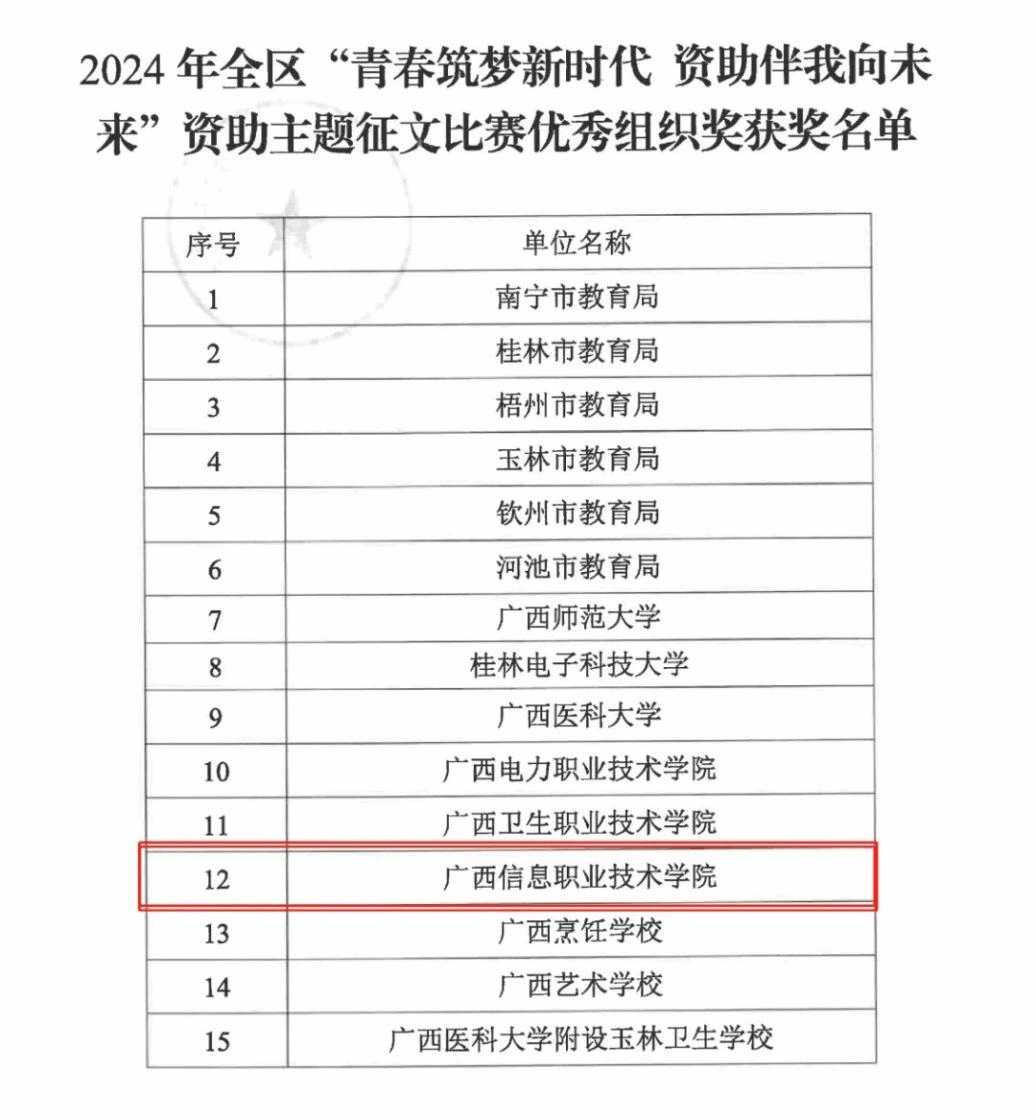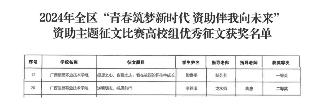 学生工作部(资助中心) 高惠报道 近日,自治区教育厅公布2024年全区“ 青春筑梦新时代 资助伴我向未来”资助主题征文比赛获奖名单,我校梁嘉雯同学作品《感恩之心,自强之志:我在祖国的怀抱中成长》荣获一等奖、李铭泽同学作品《逆境砺志,感恩前行》荣获二等奖,陆芳芳、龙水秀、高惠3位老师获评优秀指导老师,学校获优秀组织奖。