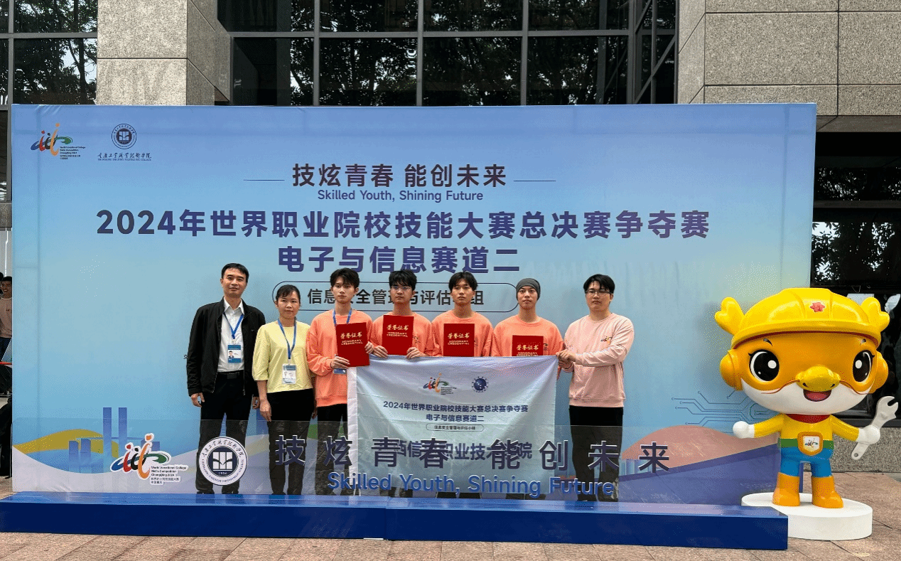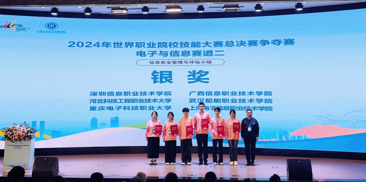 北斗与通信学院(智能制造学院) 陶华宁报道 10月26日上午,在2024年世界职业院校技能大赛总决赛争夺赛上传来喜讯,我校郭摄锋、黄坚清、黄熙壬、曾梓洋等4位同学组成的团队,从全国61支队伍、233名参赛选手中脱颖而出,在电子与信息赛道二“信息安全管理与评估小组”赛项荣获银奖,为近年来广西职业院校参加该赛项取得的最好成绩。