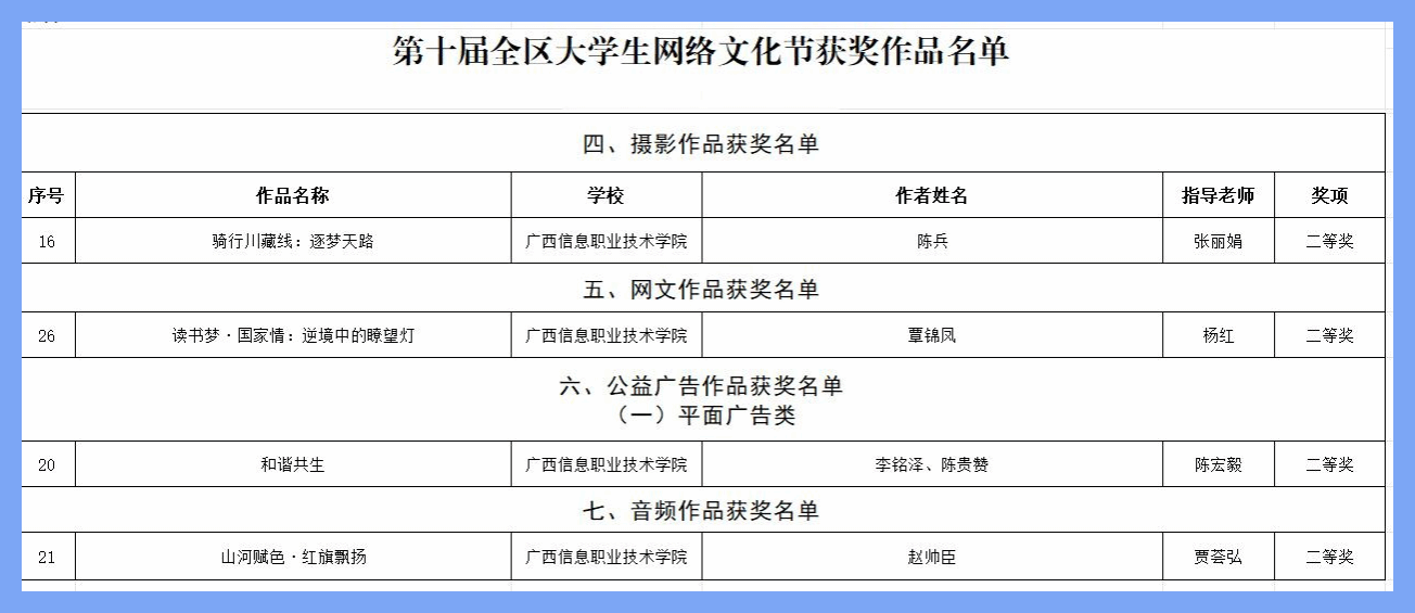 党委宣传部 郭昱轩报道 近日,自治区教育厅、自治区党委网信办下发《自治区教育厅自治区党委网信办关于公布第十届全区大学生网络文化节和2024年全区高校网络教育优秀作品推选展示活动获奖名单的通知》,我校在摄影、网文、公益广告、音频4类作品中分别获奖,其中陈兵同学作品《骑行川藏线:逐梦天路》获得摄影作品类二等奖(指导老师:张丽娟);覃锦凤同学作品《读书梦·国家情:逆境中的瞭望灯》获得网文作品类二等奖(指导老师:杨红);李铭泽、陈贵赞同学作品《和谐共生》获得公益广告作品(平面广告类)二等奖(指导老师:陈宏毅);赵帅臣同学作品《山河赋色·红旗飘扬》获得音频作品类二等奖(指导老师:贾荟弘),实现我校在全区大学生网络文化节和全区高校网络教育优秀作品推选展示活动获奖“质”和“量”的双突破!