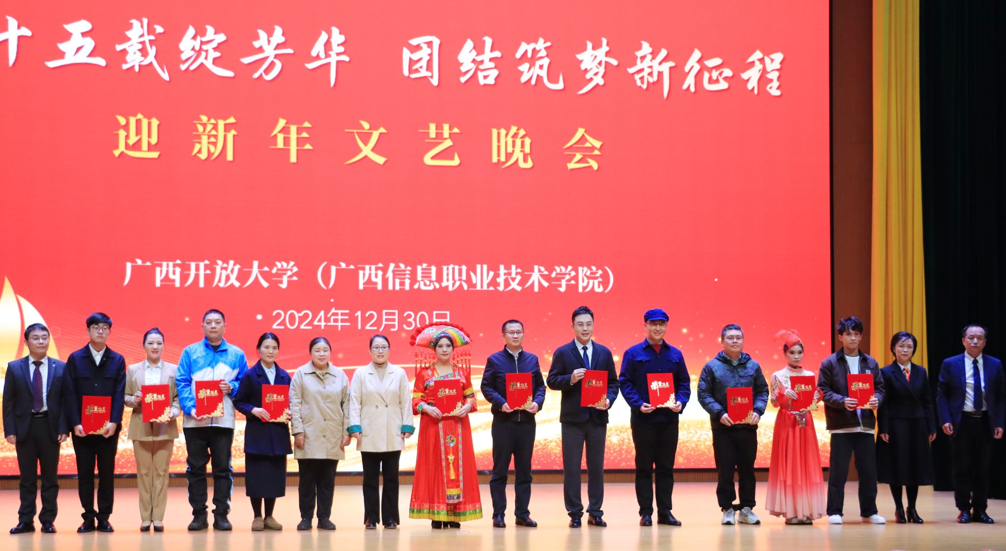 党委宣传部 黎桃桃报道 在这辞旧迎新的美好时刻,在全体师生的满怀期待中,12月30日晚,我校以“四十五载绽芳华,团结筑梦新征程”为主题的迎新年文艺晚会在五象校区大学生活动中心隆重举行。广西开放大学校领导、广西信息职业技术学院院级领导,各职能部门,二级学院领导、老师和同学们齐聚一堂,共同观看文艺演出,迎接新年到来。