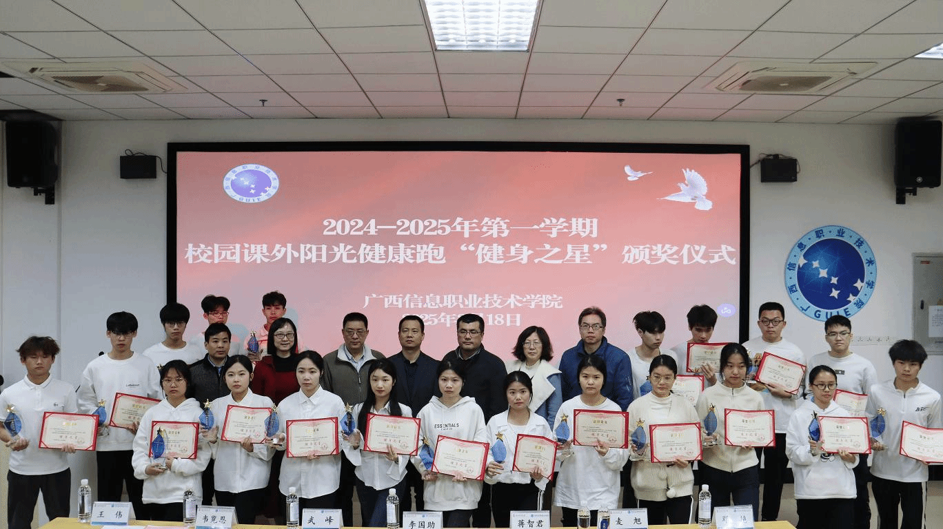 通识教育学院 廖美妙报道 为推动校园体育文化建设,提高同学们的身体综合素质,我校于3月18日在鲁班楼101阶梯教室举行2024-2025学年第一学期校园课外阳光健康跑“健身之星”颁奖仪式,对“健康跑”活动中表现突出的潘吉军等20名同学予以表彰,授予校级“健身之星”称号。广西信息职业技术学院副院长李国助、各二级学院领导及师生代表出席本次颁奖仪式。颁奖仪式由通识教育学院副院长王伟主持。