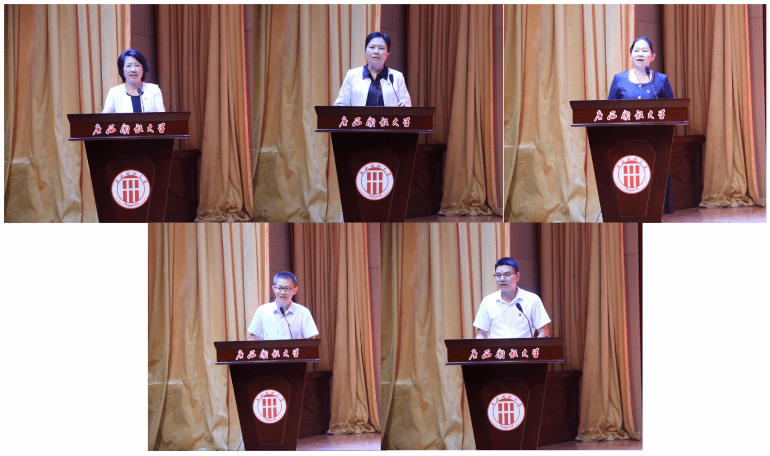 大赛邀请了广西中医药大学基础医学院党委书记周江煜,南宁师范大学法学与社会学院党委书记、学校教学督导文科组长许建,广西职业师范学院党委宣传部部长陆冰,广西交通职业技术学院通识教学部党总支书记梁科,广西幼儿师范高等专科学校党委组织部副部长李盛勇等五位校外专家担任评委,他们分别对“党建品牌创建思路展示”“微党课讲授”两个环节作了现场点评指导。