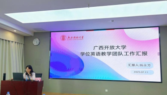 通识教育学院 冯颖 报道 为深化教育教学改革,提高学位英语教学质量,7月11日,学校召开全区开放教育学位英语专题研讨会。副校长黄远鸣出席会议并致辞,通识教育学院院长韦览恩宣布成立“广西开放大学学位英语中心教研组”,学院教授杨永芳汇报2024—2025年学位英语考试工作,并传达国家开放大学学位英语考试最新会议精神。会议由通识教育学院英语教研室主任李圆圆主持。