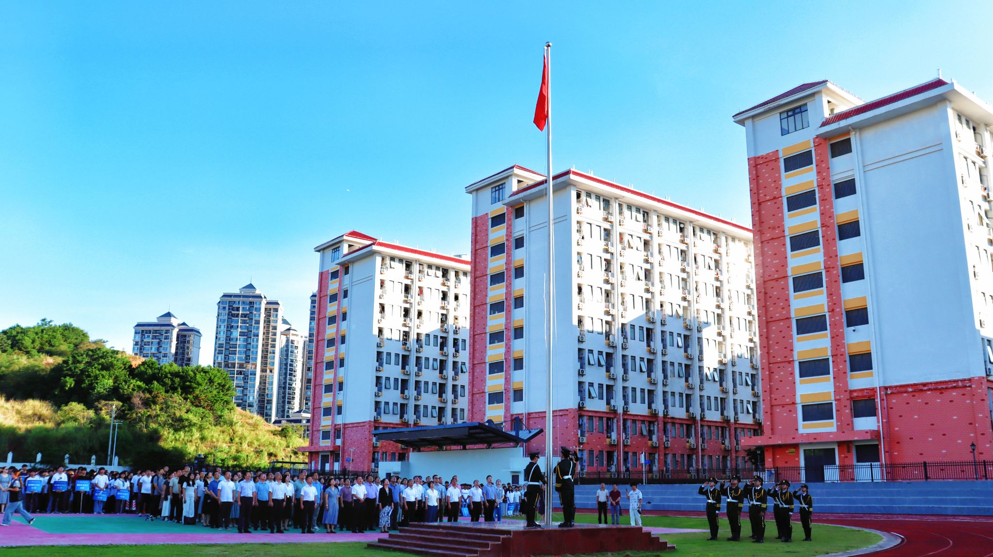 晨光熹微,国旗护卫队步伐铿锵,护送鲜艳的五星红旗入场。在雄壮的《义勇军进行曲》中,全体师生肃立致敬,齐声高唱国歌,目光随国旗冉冉上升。