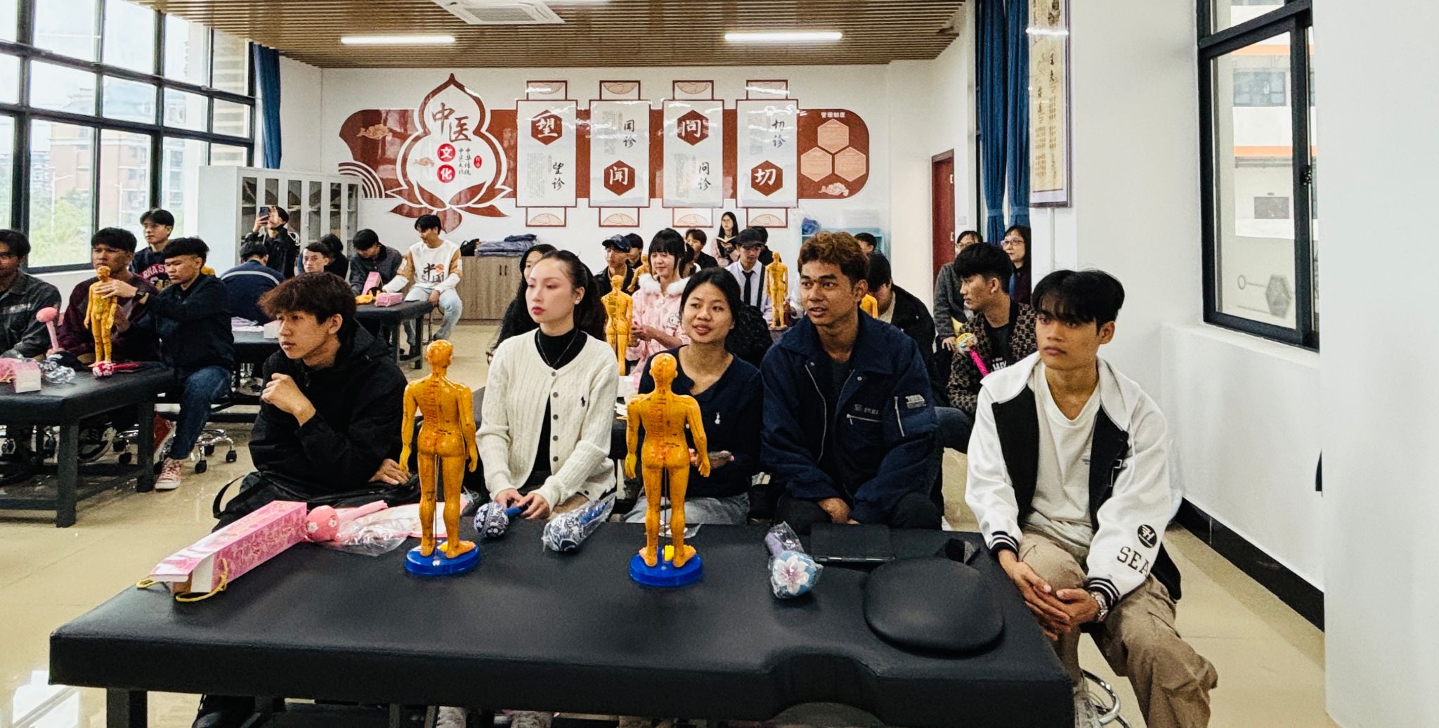本次研学培训由通识教育学院组织。来自泰国、老挝的国际学生在研学中亲身感受了中医的魅力和东方养生文化的独特价值,国际学生们不仅收获了中医健康养生知识,还学习实践了中医穴位推拿技能,亲身体验中医文化的博大精深,两校师生在交流中建立起真挚友情。我校《健康管理》专业教学团队黄晶老师不仅从中医传统文化的角度切入,详细解读了腧穴、经络等知识,还通过实际操作展示,生动地呈现了中医养生保健的独特魅力。国际学生们还一一体验了中医治愈身心的传统疗法,纷纷对其神奇的疗效赞不绝口。