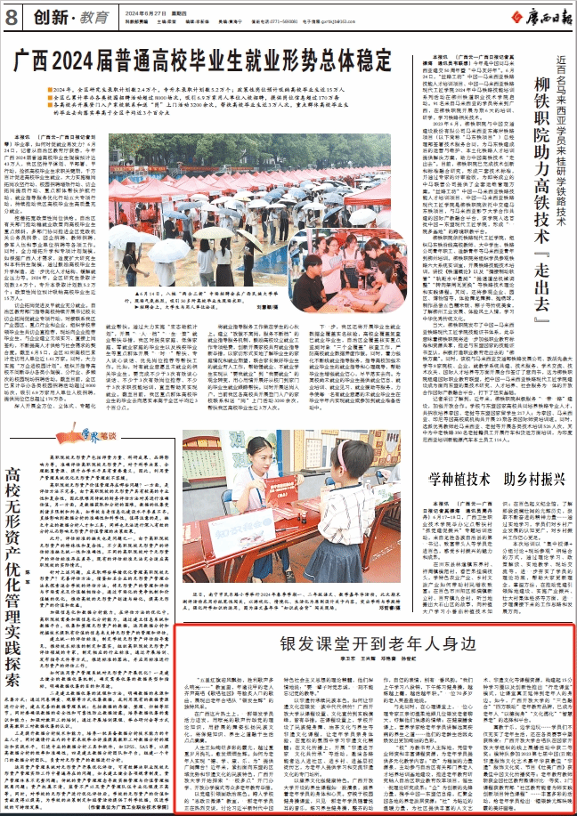 2024年6月27日,广西日报008版以《银发课堂开到老年人身边》为题报道我校老年教育情况,现将报道转载如下: