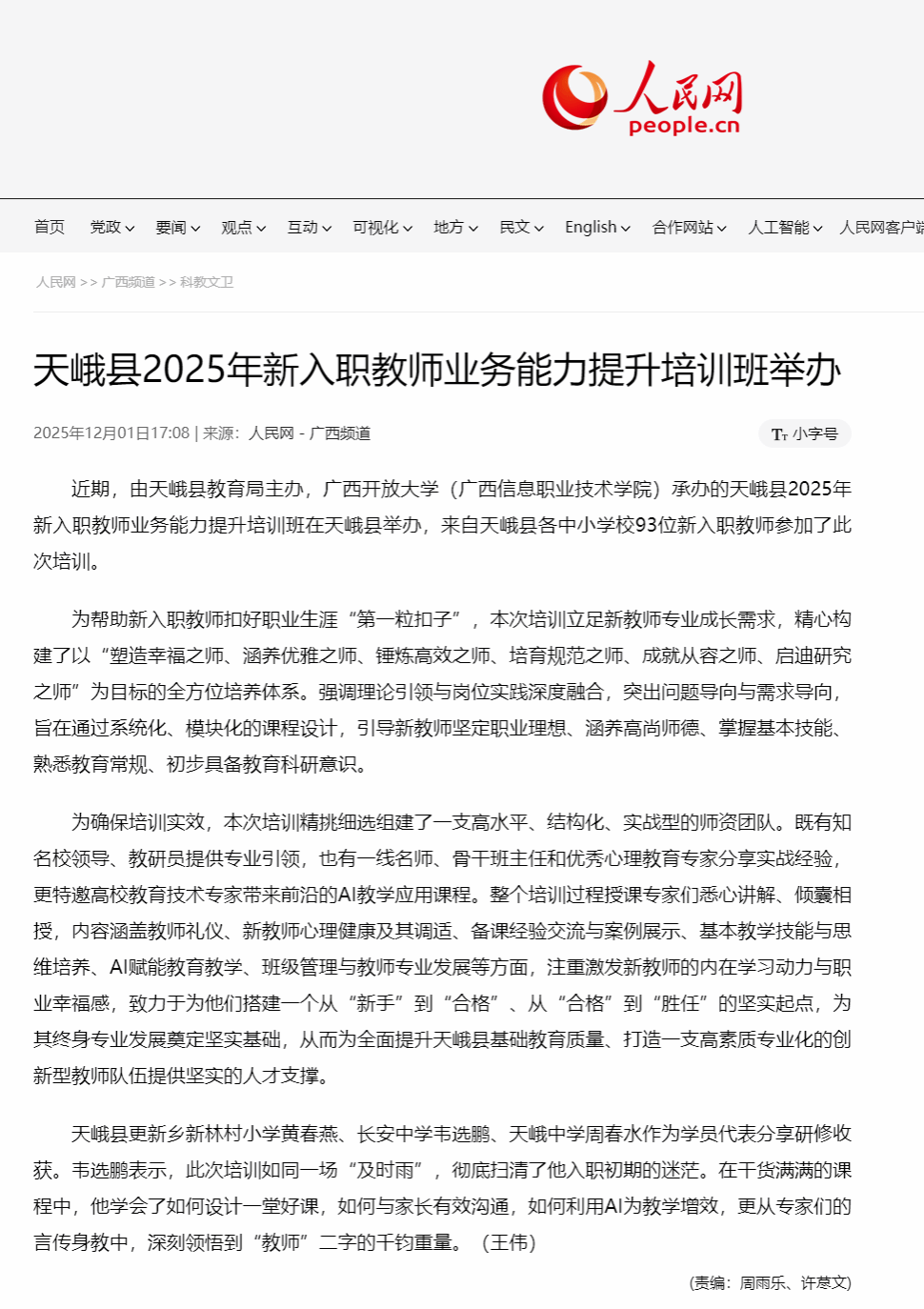 12月1日,人民网-广西频道以“天峨县2025年新入职教师业务能力提升培训班举办”为题,报道了由天峨县教育局主办,广西开放大学(广西信息职业技术学院)承办的天峨县2025年新入职教师业务能力提升培训班在天峨县举办,来自天峨县各中小学校93位新入职教师参加此次培训的相关情况。现将报道转载如下。