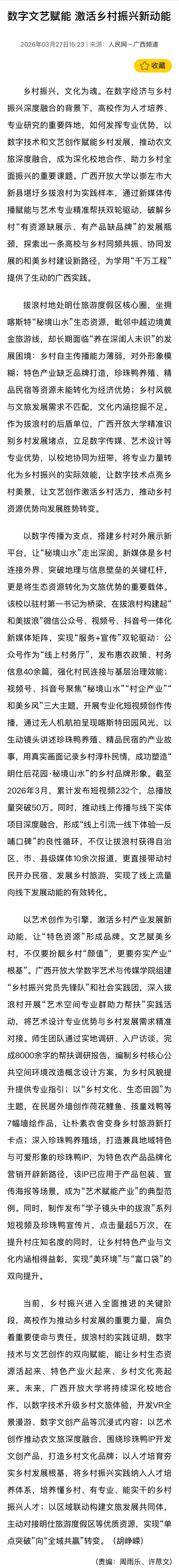 3月27日,人民网—广西频道以“数字文艺赋能 激活乡村振兴新动能”为题,报道了广西开放大学以崇左市大新县堪圩乡拔浪村为实践样本,通过新媒体传播赋能与艺术专业精准帮扶双轮驱动,破解乡村“有资源缺展示、有产品缺品牌”的发展瓶颈,探索出一条高校与乡村同频共振、协同发展的和美乡村建设新路径,为学用“千万工程”提供了生动的广西实践的相关情况。现将报道转载如下。