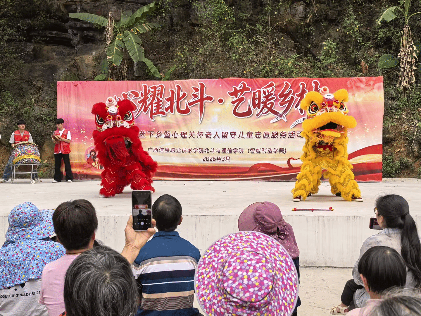 北斗与通信学院(智能制造学院) 周雨珊 报道 为深入传承弘扬雷锋精神,厚植“奉献、友爱、互助、进步”的志愿服务理念,3月28日,北斗与通信学院(智能制造学院)分团委组织团员青年、文艺骨干组成志愿服务队,赴广西大新县堪圩乡谨汤村开展 “心耀北斗・艺暖乡村” 文艺下乡暨心理关怀志愿服务活动,以文艺之美、暖心之举、陪伴之谊,为乡村群众送上别样温暖,让雷锋精神在乡村振兴一线绽放光芒。