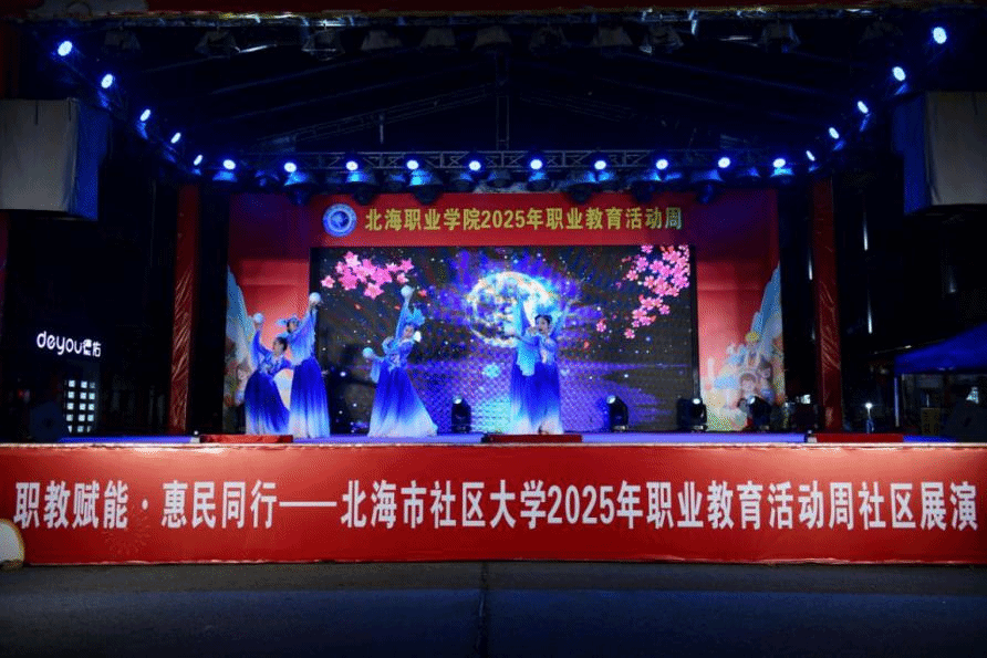 北海开放大学 黄春媚 报道 当夜幕降临北海市疍家小镇,300 余名居民翘首以盼的科技盛宴准时启幕。5 月 14 日晚,由北海市社区大学承办的北海职业学院2025年职教周系列活动之“职教赋能、惠民同行”社区技能展演,以一场震撼人心的无人机编队光影秀拉开帷幕。这次活动不仅是职业教育成果的集中展示,更是校社联动赋能社区发展的生动实践。