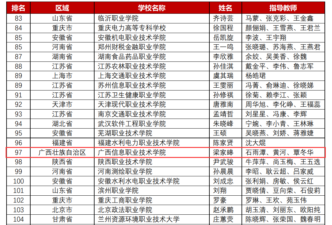 本次大赛全国共计712所高职高专院校约7.3万名学生参赛。在全国决赛中,我校梁家皞、杨圣斌同学与全国623所高职高专院校的1066名选手进行全国赛第一轮客观题赛比拼,角逐前100名主观题答题资格。梁家皞以广西第一的成绩冲出重围,跻身全国100强,获得晋级主观题比赛资格,也是广西唯一一名能进入主观题环节的选手。在后续的比赛中表现优异,最终荣获三等奖。