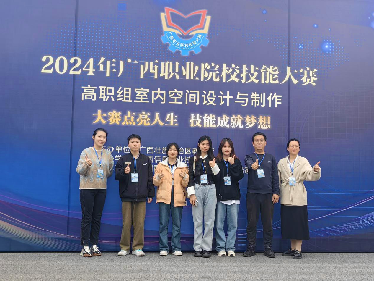 数字艺术学院 李舟 报道 2024年3月15-17日,由自治区教育厅主办、广西信息职业技术学院承办的2024年广西职业院校技能大赛高职组“室内空间设计与制作”赛项在广西信息职业技术学院隆重举行,共吸引了全区29所高校57支参赛队伍的114名参赛选手齐聚一堂,展开了一场激烈的竞技盛宴。经过激烈的角逐,我校数字艺术学院室内艺术设计专业的梁思思、李杰团队脱颖而出,荣获区级一等奖的殊荣。