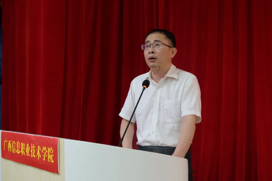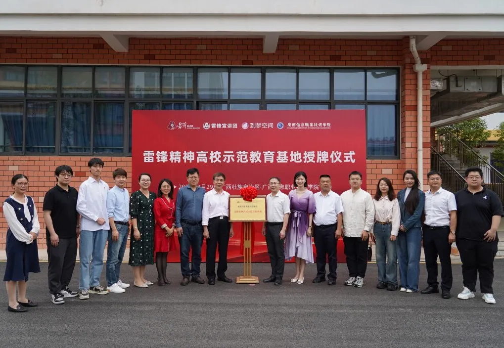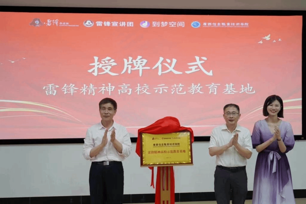 校团委 温舒琳 欧淑玲 周玉报道 3月29日下午,“雷锋精神高校示范教育基地”授牌仪式在广西信息职业技术学院举办,成为广西唯一一所被授予“雷锋精神高校示范教育基地”的高职院校。《雷锋》杂志社编辑部主任、雷锋宣讲团团长卜金宝,“到梦空间”系统运营中心、《雷锋》杂志社广西工作部相关人员,学校校长助理陈广杰,校团委书记洪姣龙,广西农业职业技术大学、广西电力职业技术学院等6所高校团委书记出席活动,二级学院分管学生工作负责人,辅导员以及团学骨干代表参加活动。
