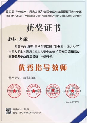 公共教学部 赵冬 报道 近日,我校学子在第四届“外教社·词达人杯”全国大学生英语词汇能力大赛广西赛区夺得佳绩,囊括省(区)赛二等奖、三等奖。