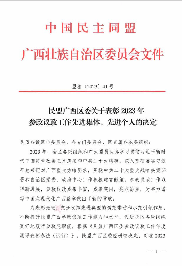 党委统战部报道 为表彰先进,树立典型,2023年12月29日,民盟广西区委发文表彰2023年参政议政工作先进集体、先进个人。我校民盟支部被授予“2023年民盟广西区委反映社情民意信息工作优秀基层组织”称号。