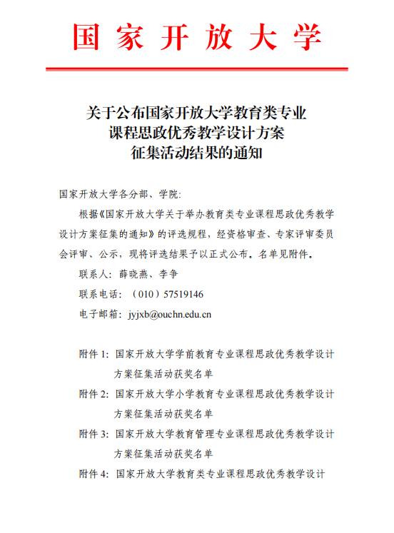 文理学院 杨雨芊报道 2023年12月22日,国家开放大学公布了教育类专业课程思政优秀教学设计方案征集活动的获奖名单,我校共有2项作品获奖。其中二等奖1项,三等奖1项。