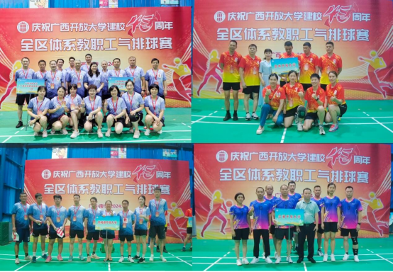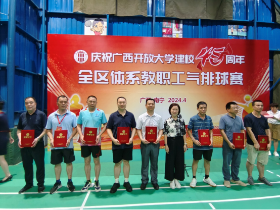 校工会委员会 黎桃桃报道 为了庆祝广西开放大学建校45周年,丰富全区开放大学体系教职工文化生活,增强办学体系凝聚力,4月28日-29日,我校在南宁举行庆祝广西开放大学建校45周年全区开放大学体系教职工气排球赛。学校领导王兴辉、黄美娟、黄鹄、翁洁、李敏智、刘绍英、辛立章出席活动。副校长、工会主席李敏智主持开幕式。