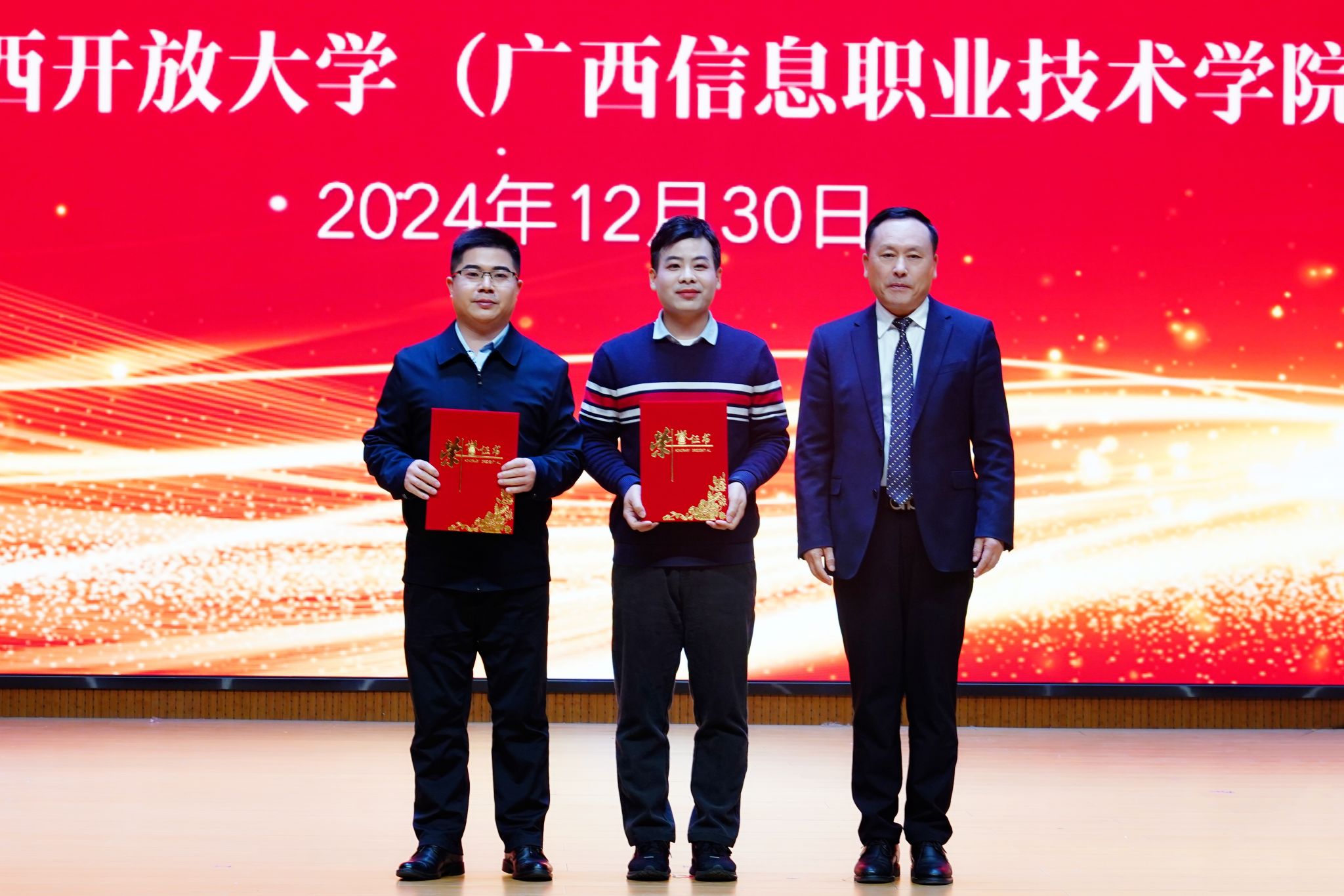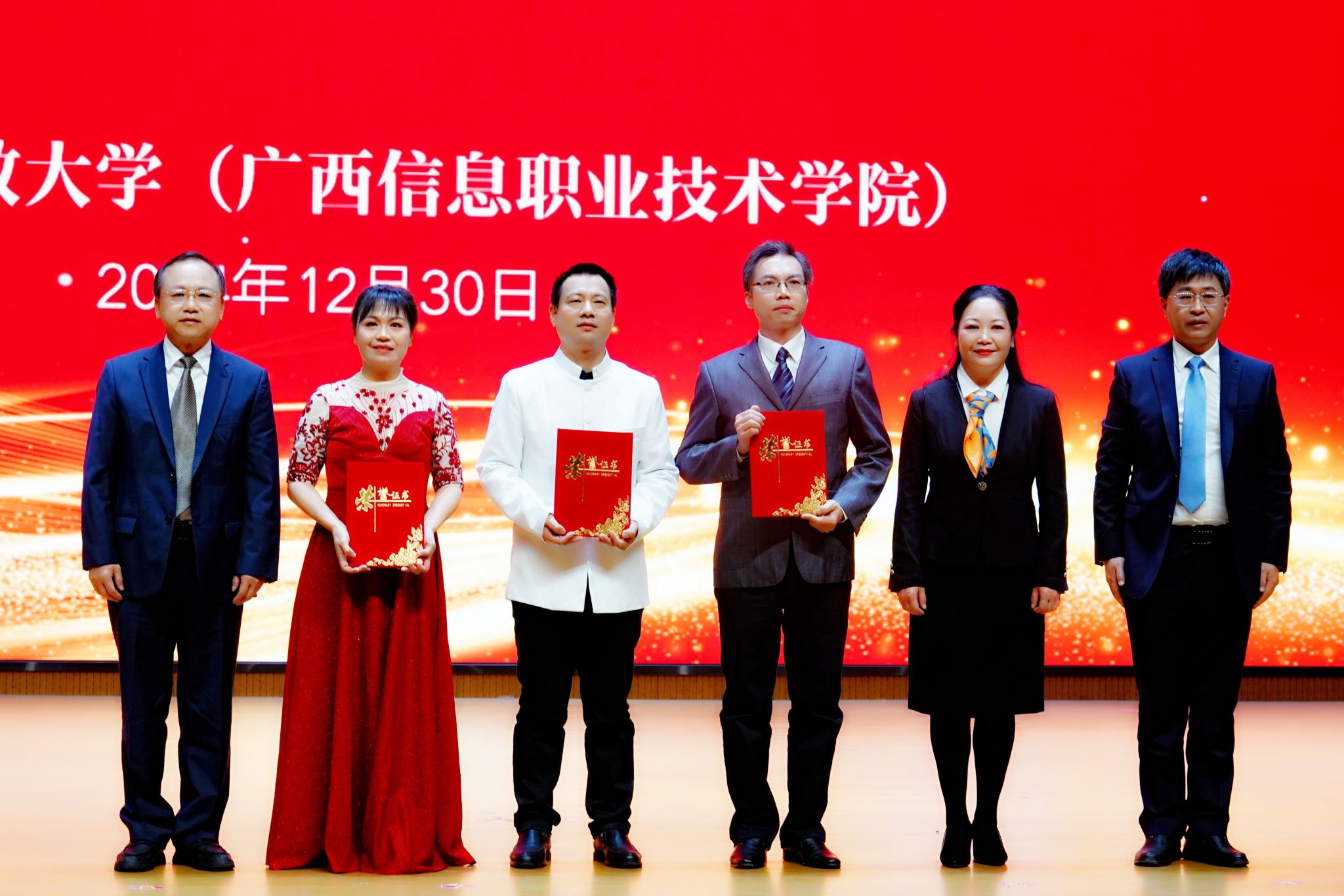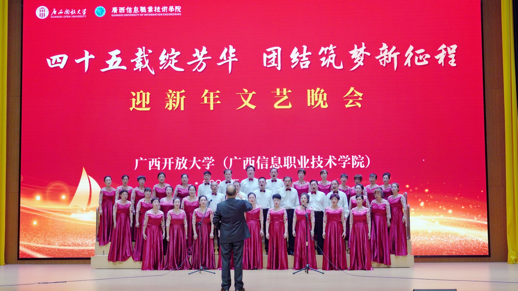 党委宣传部 黎桃桃报道 在这辞旧迎新的美好时刻,在全体师生的满怀期待中,12月30日晚,我校以“四十五载绽芳华,团结筑梦新征程”为主题的迎新年文艺晚会在五象校区大学生活动中心隆重举行。广西开放大学校领导、广西信息职业技术学院院级领导,各职能部门,二级学院领导、老师和同学们齐聚一堂,共同观看文艺演出,迎接新年到来。