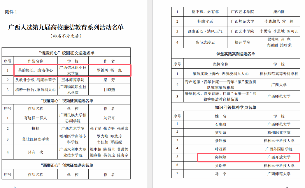 纪委办公室 姚姗汝报道 近日,自治区党委教育工委办公室转发了《教育部办公厅关于公布第九届高校廉洁教育系列活动结果的通知》,全国高校廉洁教育系列活动共遴选出“话廉润心”校园征文100篇、知识问答优秀学员100名,其中,我校2023级影视多媒体技术3班学生覃锦凤的作品《茶韵悠长,廉洁传心》(指导老师:杨红)入选“话廉润心”校园征文遴选名单。建设工程管理专业成招学生邱颖婕入选知识问答优秀学员名单。