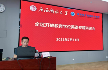 通识教育学院 冯颖 报道 为深化教育教学改革,提高学位英语教学质量,7月11日,学校召开全区开放教育学位英语专题研讨会。副校长黄远鸣出席会议并致辞,通识教育学院院长韦览恩宣布成立“广西开放大学学位英语中心教研组”,学院教授杨永芳汇报2024—2025年学位英语考试工作,并传达国家开放大学学位英语考试最新会议精神。会议由通识教育学院英语教研室主任李圆圆主持。