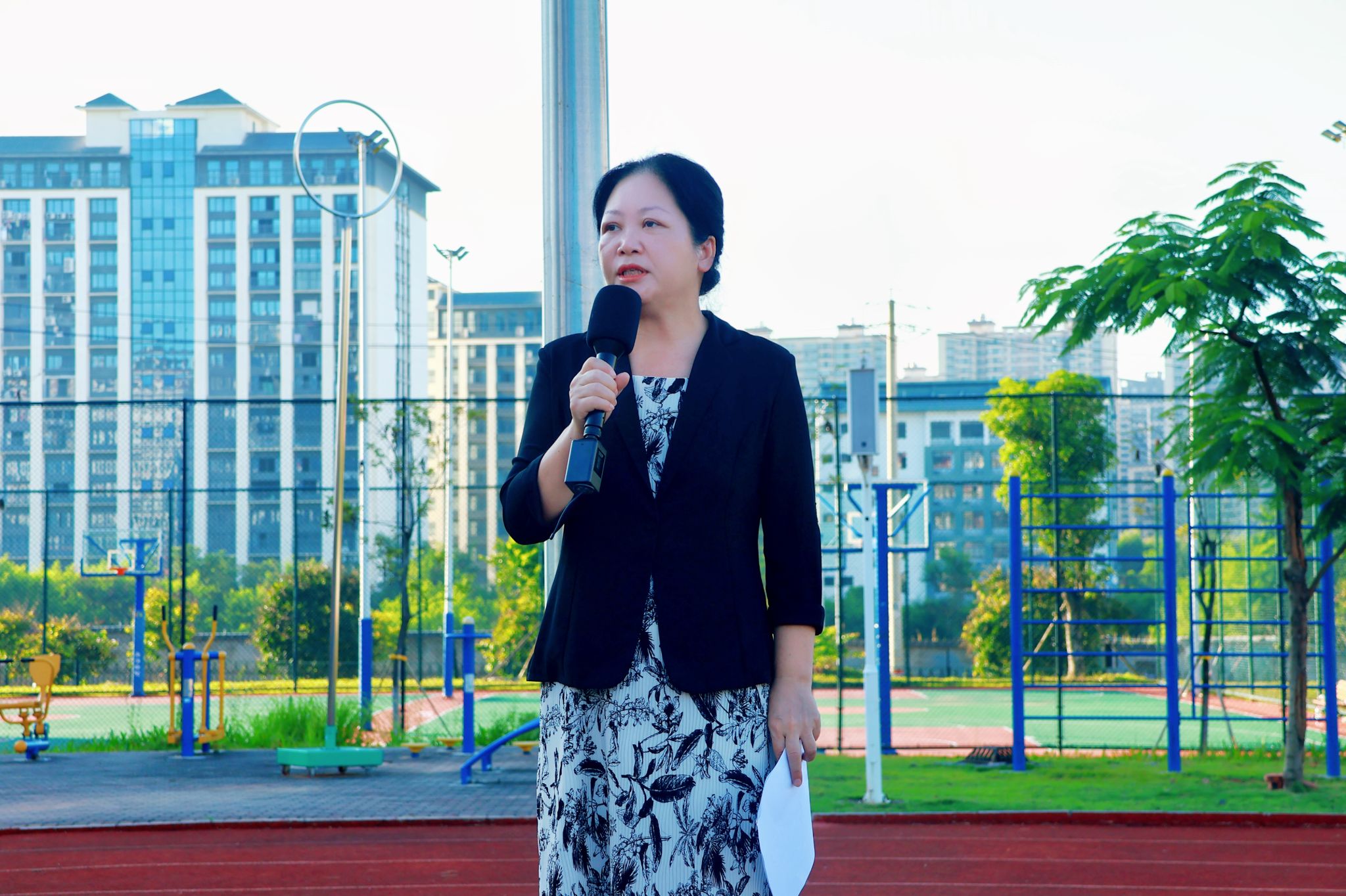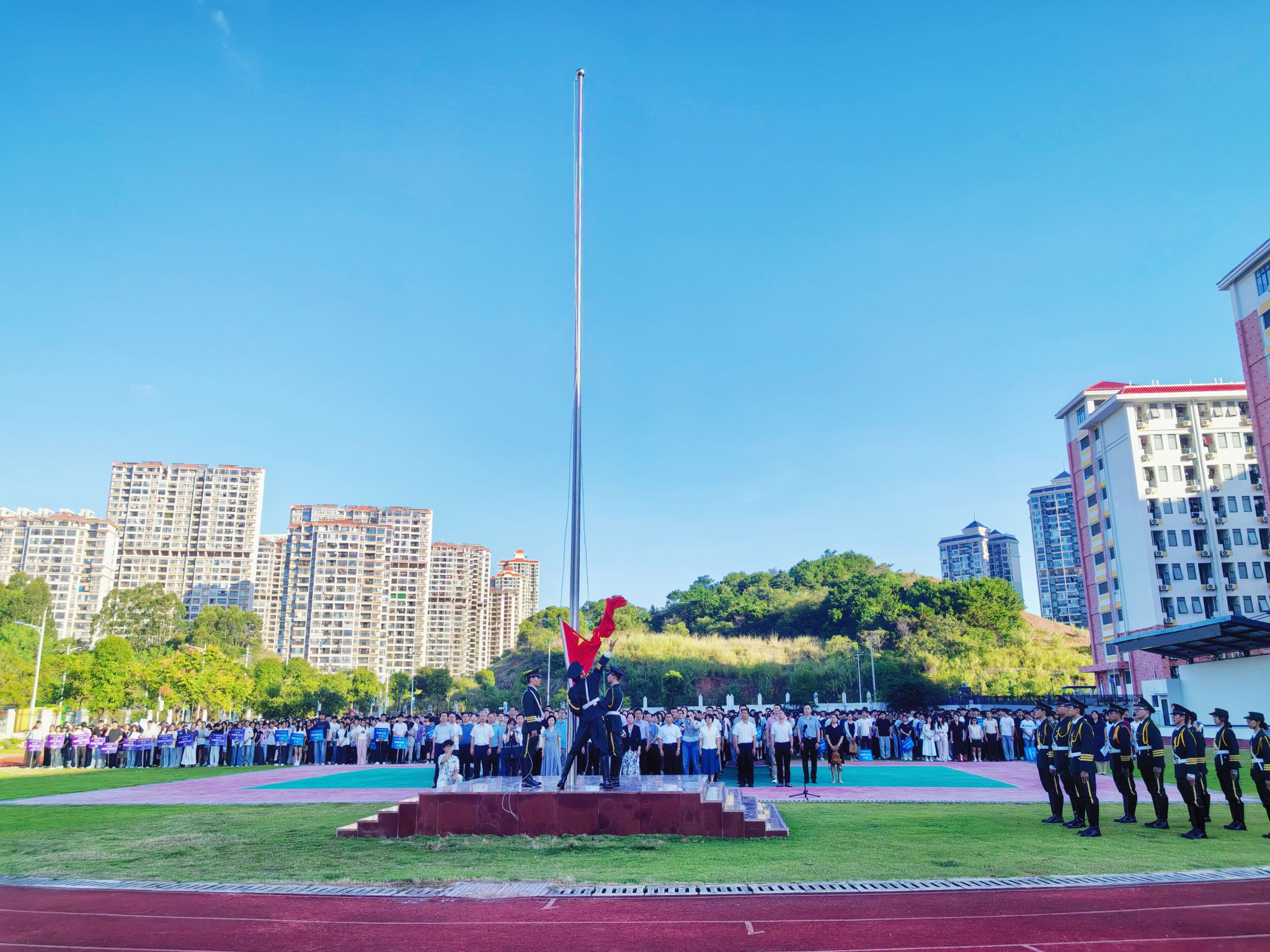 晨光熹微,国旗护卫队步伐铿锵,护送鲜艳的五星红旗入场。在雄壮的《义勇军进行曲》中,全体师生肃立致敬,齐声高唱国歌,目光随国旗冉冉上升。