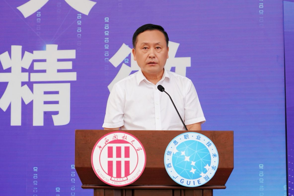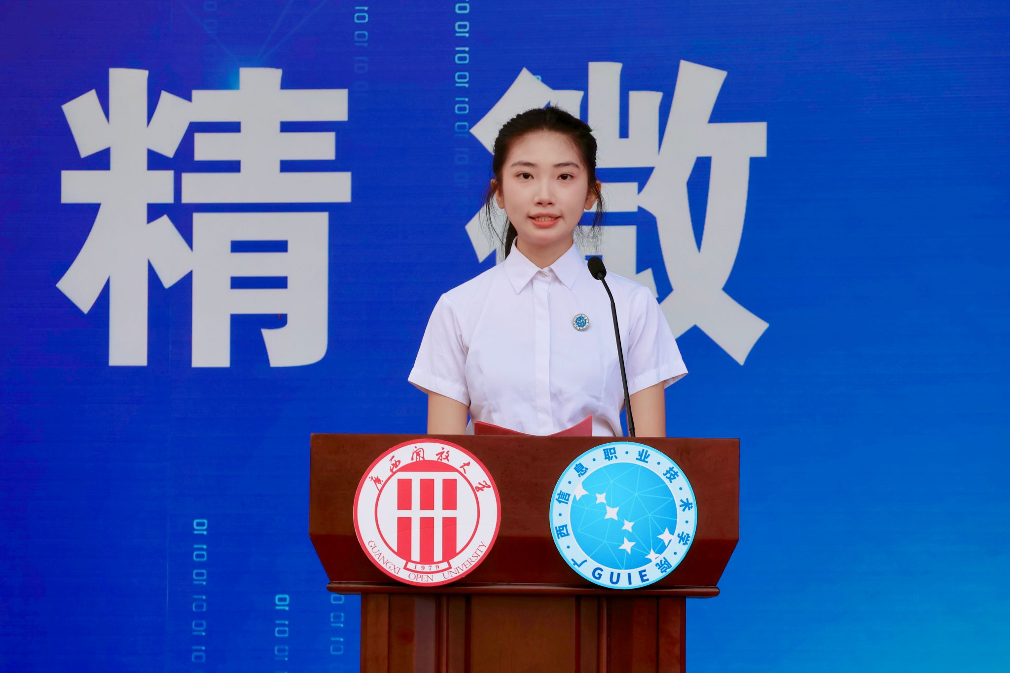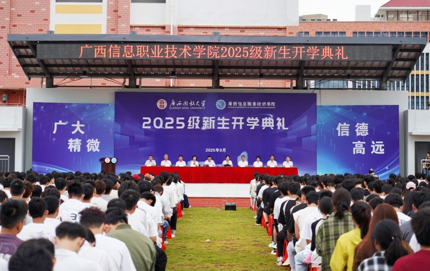 学校领导为新生代表授予学校徽章。广西信息职业技术学院党委副书记陈雪松,副院长黄河、李国助、邓明学、陈广杰,各二级学院领导班子、2025级新生班级班主任、辅导员,以及2025级全体新生参加了开学典礼。