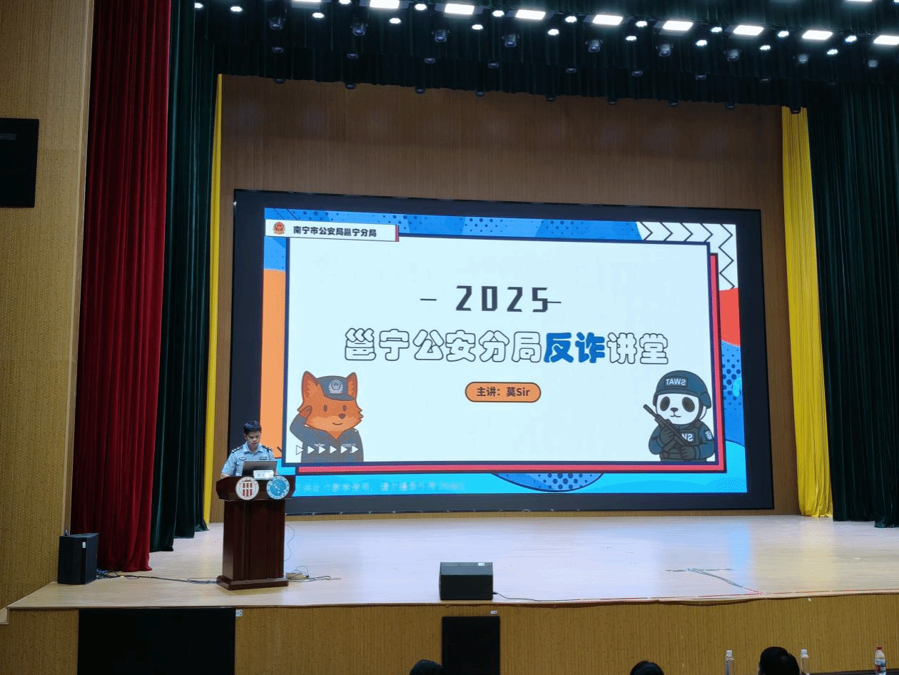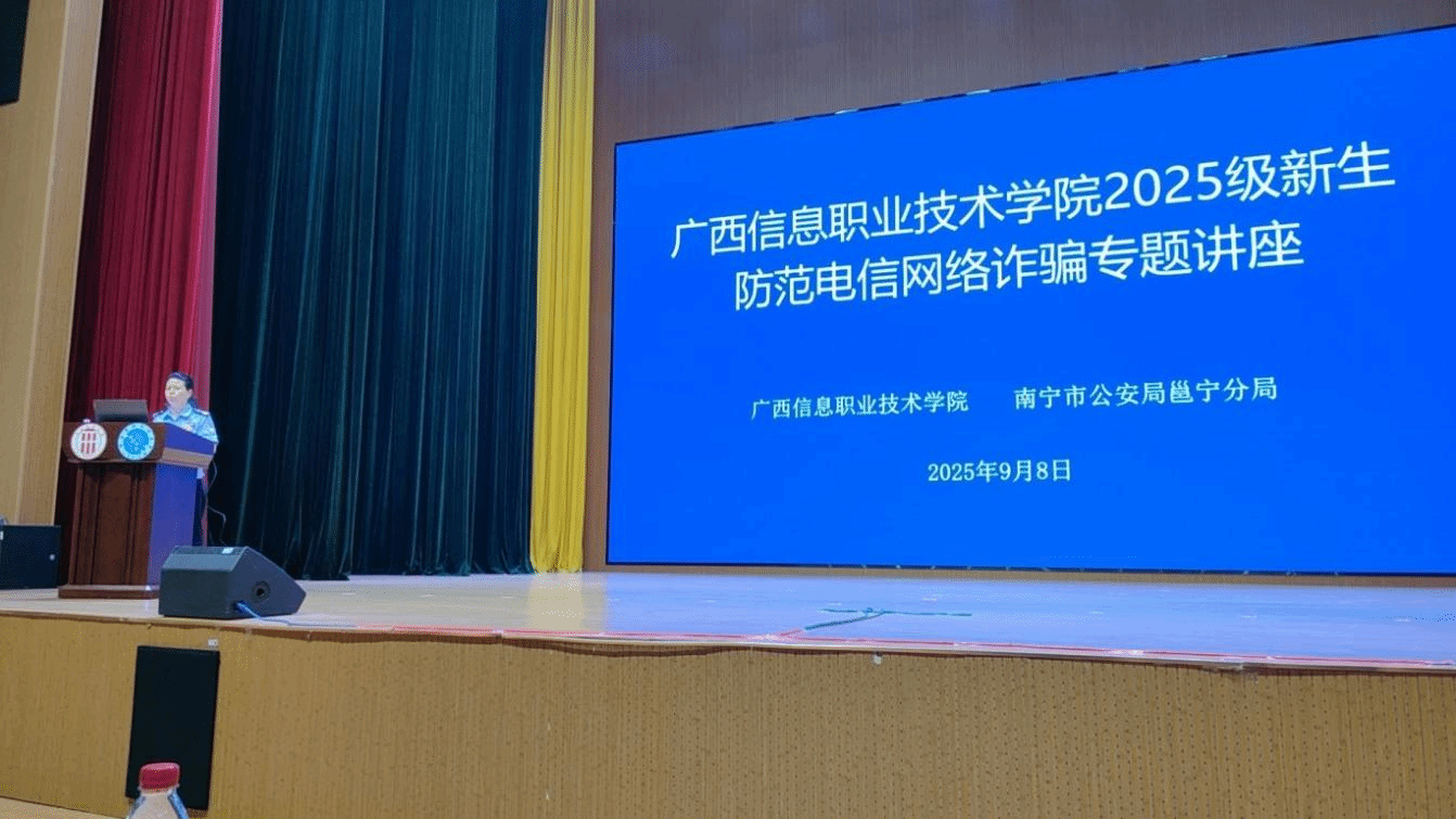 后勤保卫处 陈华 报道 9月8日下午,我校联合南宁市公安局邕宁分局为2025级新生开展主题为“筑牢反诈防线,守护校园安全”的防范电信网络诈骗专题讲座。广西信息职业技术学院副院长陈广杰作总结讲话,邕宁分局副政委谢金凤、民警莫龙顺作防诈讲座。