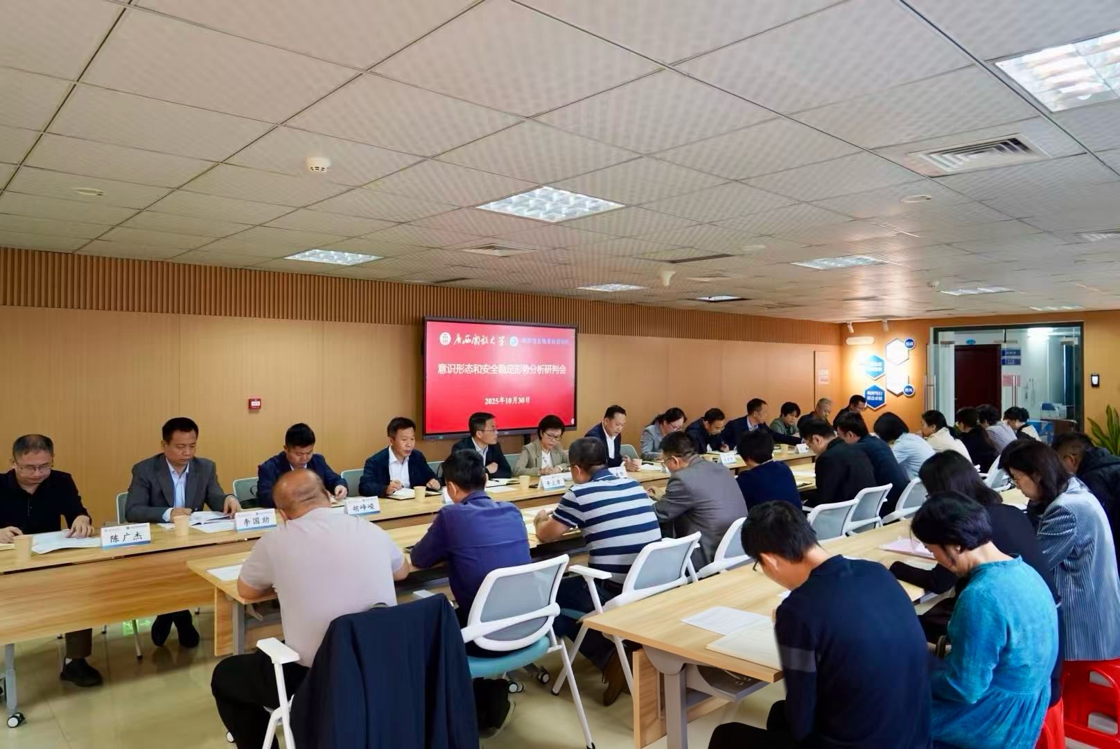 党委宣传部 侯蕾 报道 10月30日,我校组织召开意识形态和安全稳定形势分析研判会。校长王兴辉主持会议并讲话,党委副书记龙雪津传达了上级关于意识形态和安全稳定工作相关文件精神。广西开放大学校领导参加研判会。