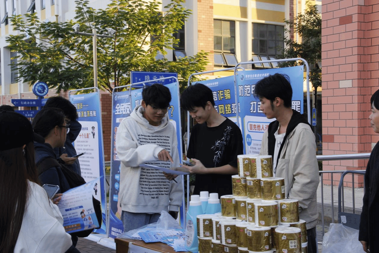 志愿者分发“反诈手册”,内容涵盖诈骗类型介绍与实用防范技巧,同学们通过“南宁市反诈骗”公众号参与防骗测试,不少同学发现自身反诈知识盲区,表示今后会加强学习,提升防范能力。答题后,大家根据防骗测试答题成绩领取抽纸、洗衣液等奖品。