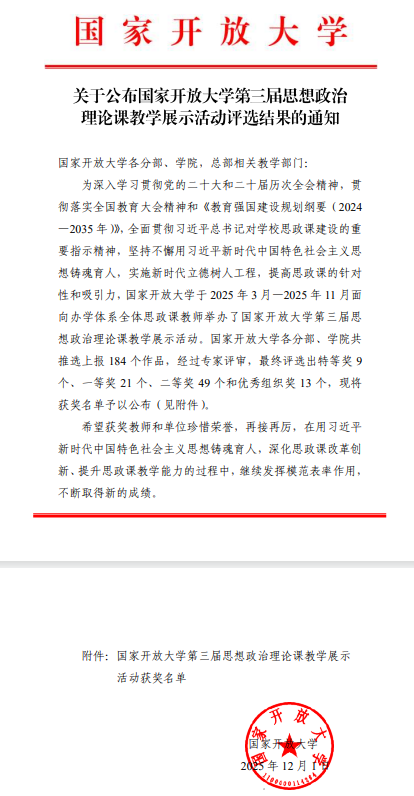 马克思主义学院 林新绣 报道 近日,国家开放大学正式公布了第三届思想政治理论课教学展示活动评选结果。我校马克思主义学院精心组织、推荐参评的作品在本次竞赛中脱颖而出,取得一等奖1项、二等奖3项的成绩。同时,我校凭借出色的组织工作荣获“优秀组织奖”。此次获奖实现了我校在该项全国权威赛事中的历史性突破,充分展示了我校思政课教学改革的丰硕成果与教师队伍扎实过硬的教学水平。