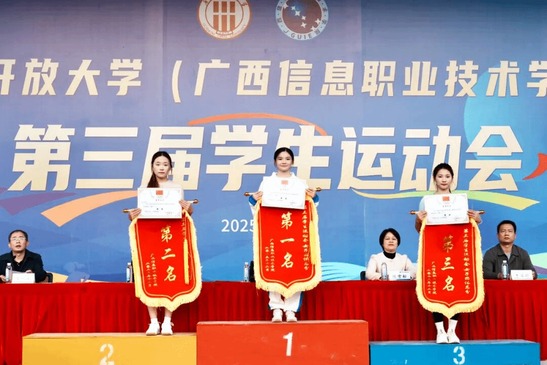 裁判长、通识教育学院教师陈采铃宣布运动会比赛成绩。本次比赛共设置100米、200米、400米、800米、1500米、跳高、跳远、铅球、4*100米接力、4*300米接力、20*50米接力、毽球、高杆抛绣球、三人板鞋竞速、羽毛球混合团体赛、乒乓球混合团体赛,共计16项比赛。经过两天的激烈比拼,按照比赛项目的设置以及男女生分组,共约620人次获奖;数字经济与管理学院、北斗与通信学院(智能制造学院)、数字艺术与传媒学院获团体总分前三名;北斗与通信学院(智能制造学院)、数字经济与管理学院获“道德风尚”奖;计算机与人工智能学院、数字艺术与传媒学院获“优秀组织奖”。