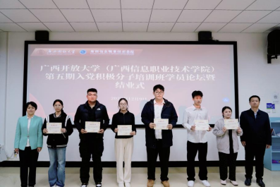 陈雪松为学员们颁发结业证书并作结业式总结讲话。广西信息职业技术学院副院长李国助为学员们颁发结业证书。各二级学院党总支书记、专职组织员和第五期入党积极分子培训班学员共70余人参加结业式。何艳珍主持结业式。