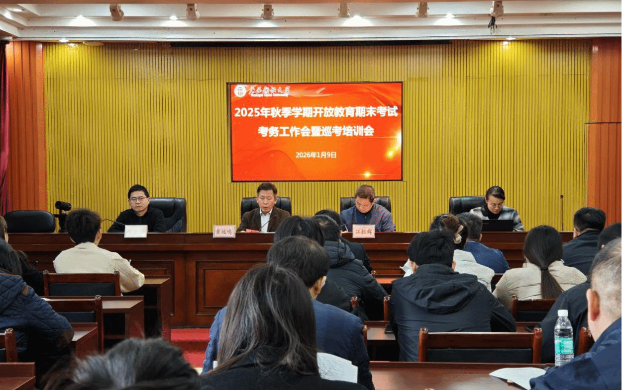 开放教育学院 余德富 报道 1月9日下午,学校以“线下线上”结合方式,召开广西开放大学2025年秋季学期开放教育期末考试考务工作会暨巡考培训会。副校长黄远鸣出席会议并作部署讲话,学校纪委办公室副主任伍立凌、巡考员、直属考点主考、产业学院及开放教育学院全体人员在主会场参加现场会议,全区各市、县开放大学,学习中心负责人及考点全体考试工作人员线上参会。开放教育学院院长江祖辉主持会议。