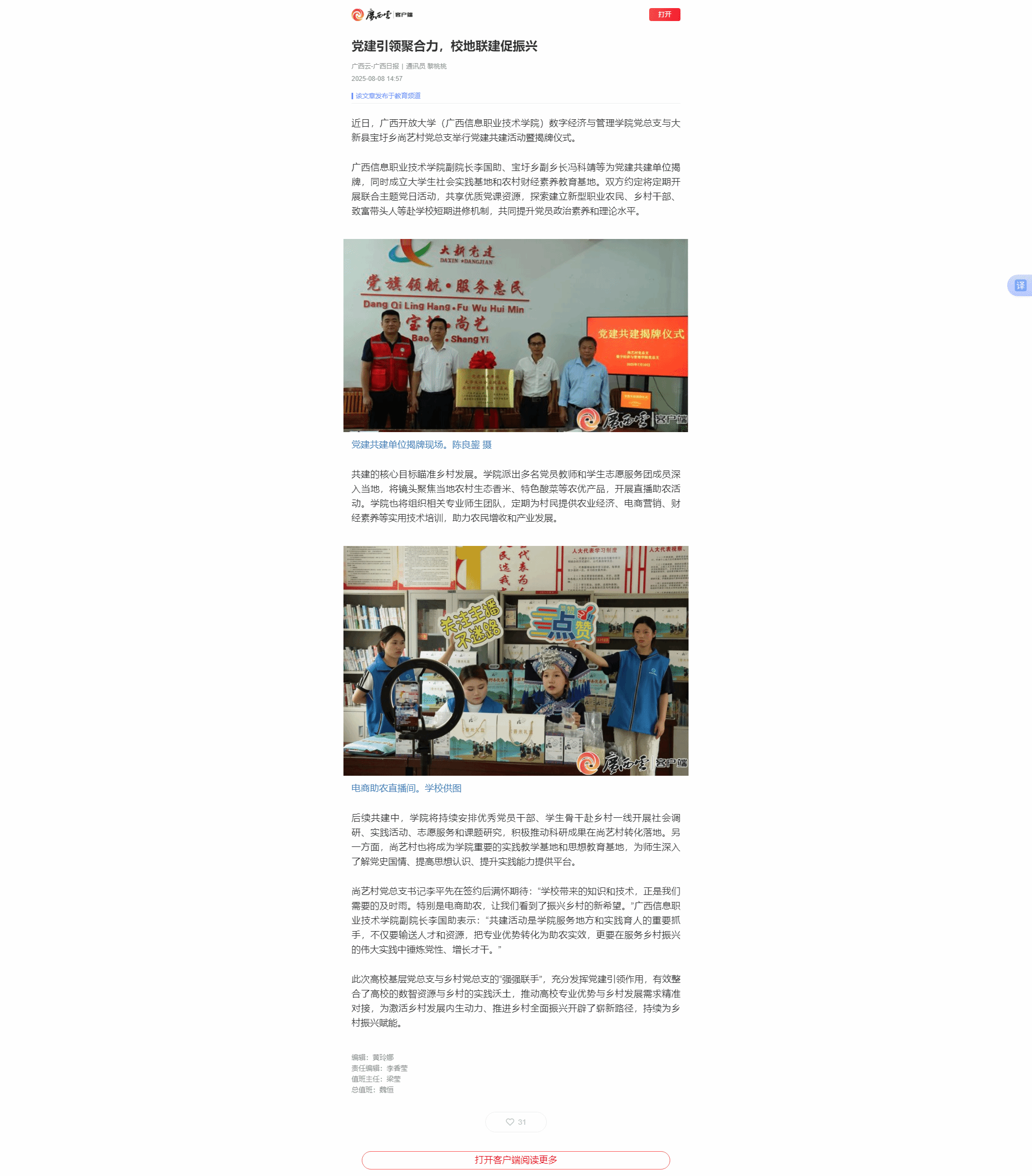 8月8日,广西云-广西日报以“党建引领聚合力,校地联建促振兴”为题,报道了广西开放大学(广西信息职业技术学院)数字经济与管理学院党总支与大新县宝圩乡尚艺村党总支举行党建共建活动暨揭牌仪式,同时成立大学生社会实践基地和农村财经素养教育基地。双方约定将定期开展联合主题党日活动,共享优质党课资源,探索建立新型职业农民、乡村干部、致富带头人等赴学校短期进修机制,共同提升党员政治素养和理论水平的相关情况。现将报道转载如下。