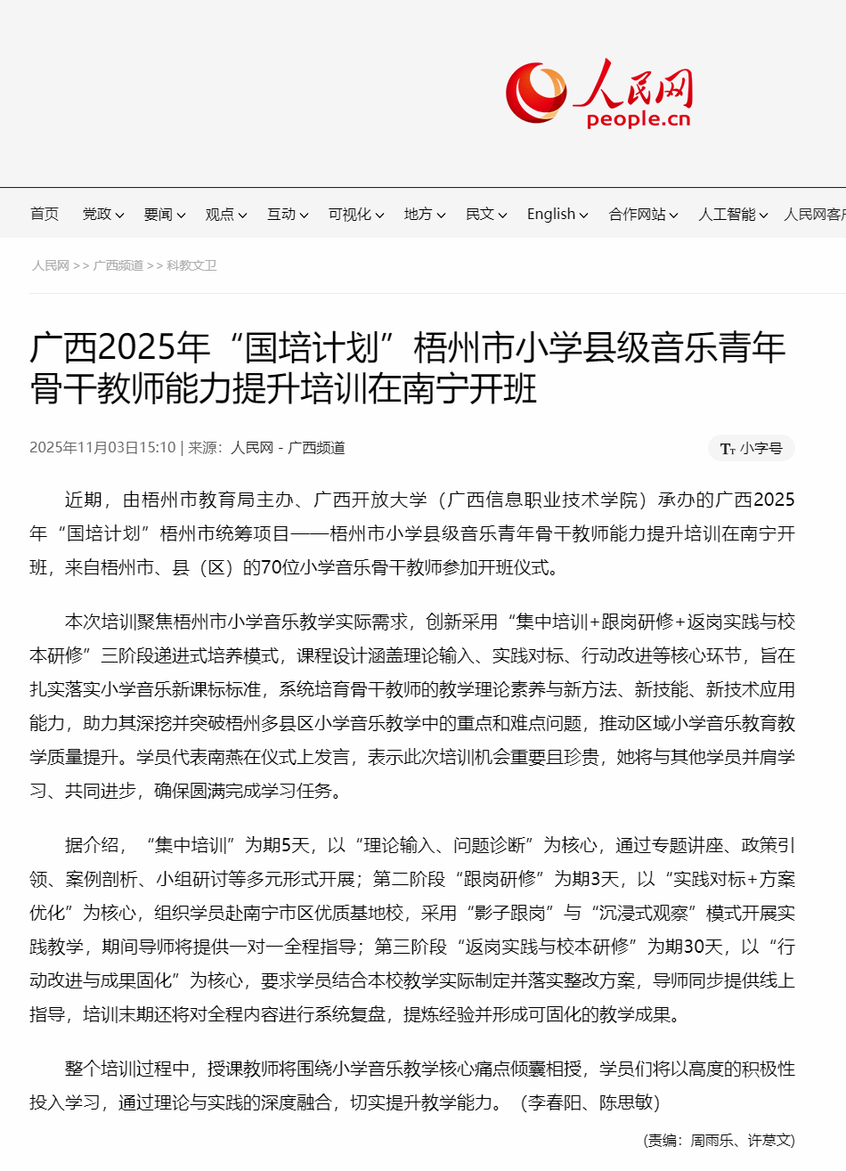 11月3日,人民网-广西频道以“广西2025年“国培计划”梧州市小学县级音乐青年骨干教师能力提升培训在南宁开班”为题,报道了由梧州市教育局主办、广西开放大学(广西信息职业技术学院)承办的广西2025年“国培计划”梧州市统筹项目——梧州市小学县级音乐青年骨干教师能力提升培训在南宁开班,来自梧州市、县(区)的70位小学音乐骨干教师参加开班仪式的相关情况。现将报道转载如下。