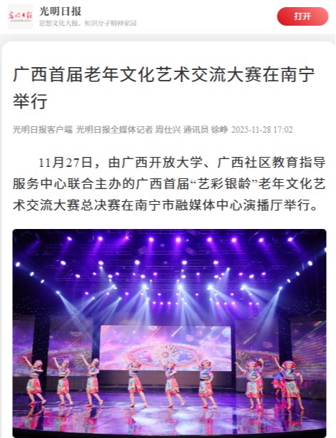 11月28日,光明日报客户端以“广西首届老年文化艺术交流大赛在南宁举行”为题,报道了11月27日,由广西开放大学、广西社区教育指导服务中心联合主办的广西首届“艺彩银龄”老年文化艺术交流大赛总决赛在南宁市融媒体中心演播厅举行。历经南宁、桂林、贵港、梧州、百色等多地海选、复赛的层层遴选,170余个形式多元的参赛节目激烈角逐,最终40个优秀作品脱颖而出,登上总决赛舞台绽放风采的相关情况。现将报道转载如下。