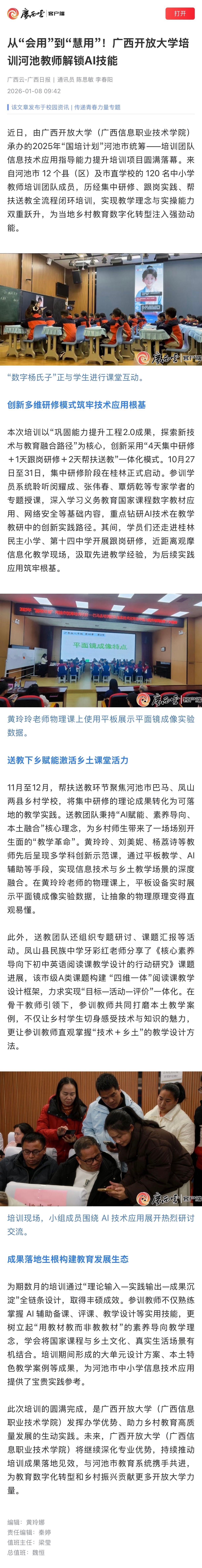 1月8日,广西云-广西日报以“从‘会用’到‘慧用’!广西开放大学培训河池教师解锁AI技能”为题,报道了由广西开放大学(广西信息职业技术学院)承办的2025年“国培计划”河池市统筹——培训团队信息技术应用指导能力提升培训项目圆满落幕。来自河池市 12 个县(区)及市直学校的 120 名中小学教师培训团队成员,历经集中研修、跟岗实践、帮扶送教全流程闭环培训,实现教学理念与实操能力双重跃升,为当地乡村教育数字化转型注入强劲动能的相关情况。现将报道转载如下。