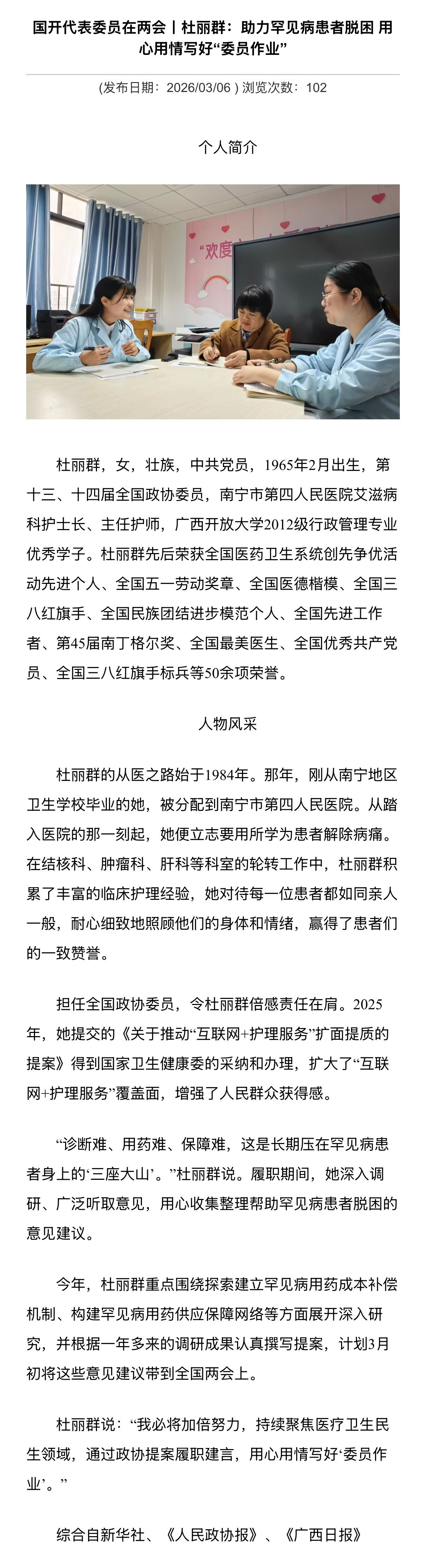 3月6日,国家开放大学时讯网以“国开代表委员在两会丨杜丽群:助力罕见病患者脱困 用心用情写好‘委员作业’”为题,报道了我校杰出校友杜丽群的先进事迹。现将报道转载如下。