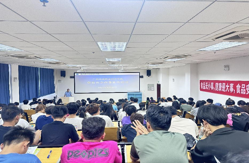 南宁市西乡塘区市场监督管理局餐饮股长李锋作“食品卫生安全防控及学生膳食营养搭配”专题讲座,讲座围绕食品安全基础知识、食品安全风险案件分析及预防处置、食物中毒预防措施等四个方面,结合近年来食品安全方面的典型案例,用通俗易懂的语言为大家普及生活中常见食品安全知识,还重点从食物的营养成分、饮食卫生习惯、营养健康等方面,向同学们科普该吃什么、该怎么吃,吃什么对身体有益,怎么吃更安全健康。