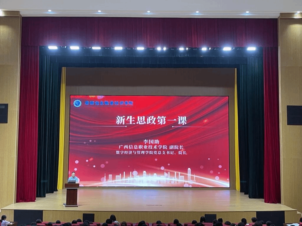 会上,广西信息职业技术学院副院长,数字经济与管理学院党总支书记、院长李国助对2024级新生的到来表示热烈欢迎,详细介绍了学校基本情况和学院办学特色,并以《青春向党,心系家国》为题,给同学们上了一堂入学思政课。他嘱咐同学们要融入集体怀抱,畅享大学生活之美;要明确大学志向,引领未来航向;要铸就良好学习习惯,攀登知识高峰;要积极参与校园活动,绽放青春光彩;要善于人际交往,携手共创和谐。同时勉励全体同学,要珍惜大学学习时光,胸怀壮志,深耕学海,紧握数字经济时代脉搏,锤炼精湛技能,努力成为堪当民族复兴重任的时代新人。