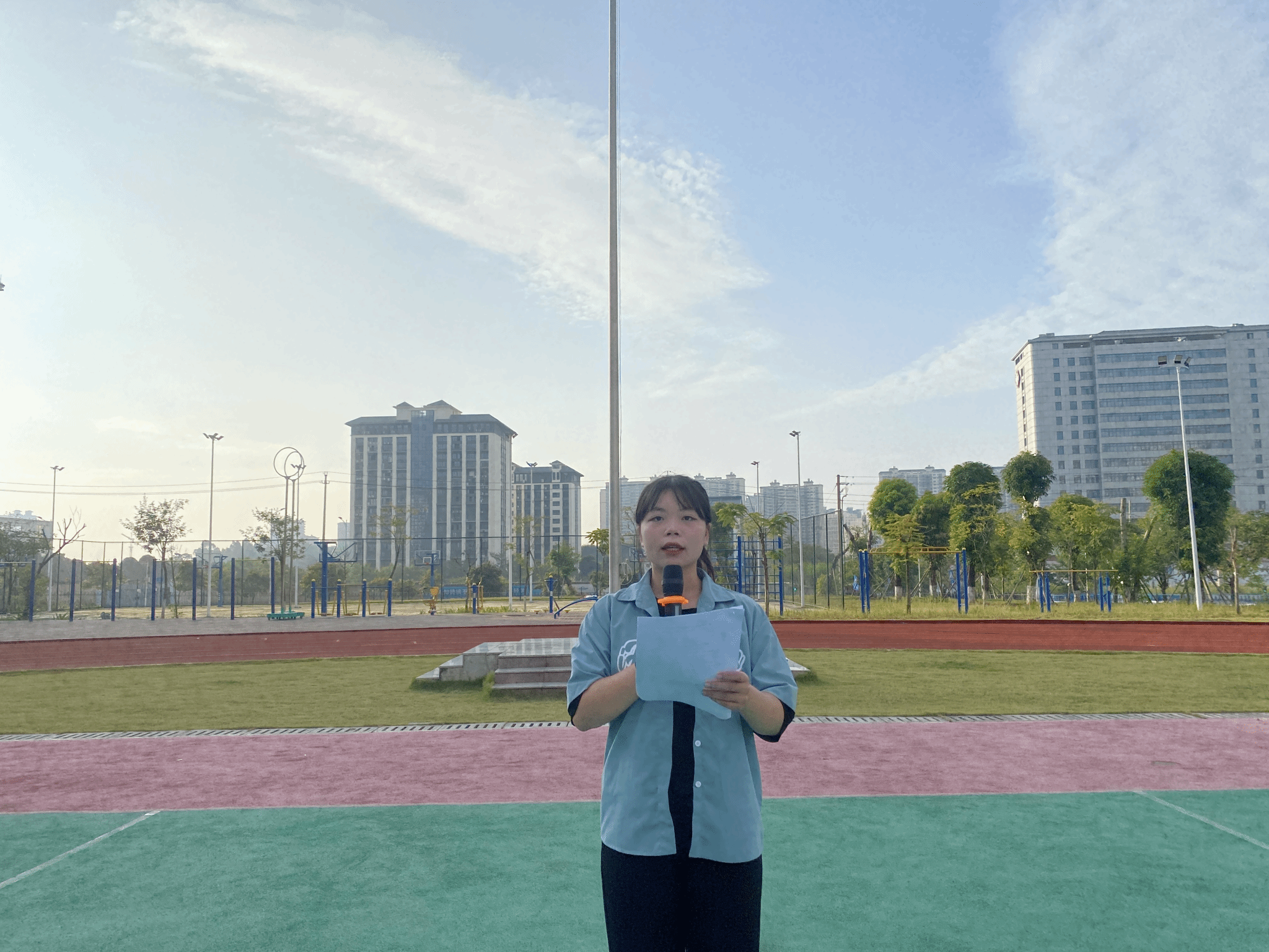 清晨,晨光洒满大地,万物生机盎然,伴随着朝阳升起,数字艺术与传媒学院、数字经济与管理学院师生1600余人齐聚田径场,在伟大的祖国即将迎来75周岁生日之际,隆重举行升国旗仪式。全体师生齐唱国歌,五星红旗在师生的注目礼中冉冉升起,迎风飘扬,每个人的心中都涌动着对祖国的无限热爱。