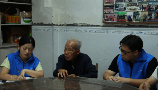 ▲服务团认真聆听非物质文化遗产“短衣壮”代表性传承人农廷兴讲解短衣壮起源