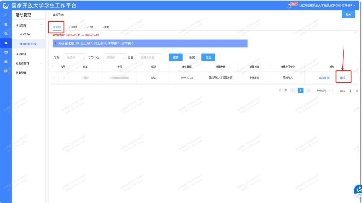 2.“未审核”列表——操作——点击“审核”。