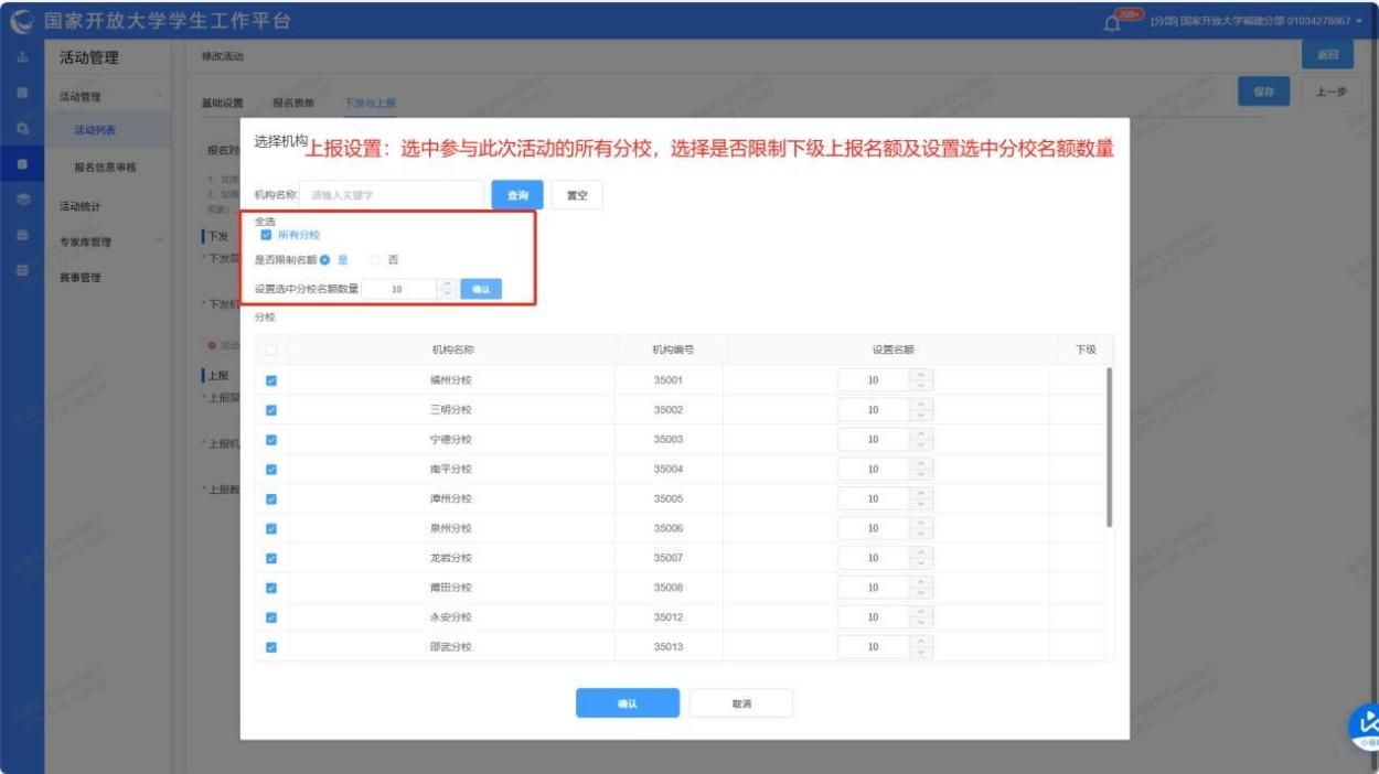 6.选择上报机构,选择是否限制名额,并设置点击确认。