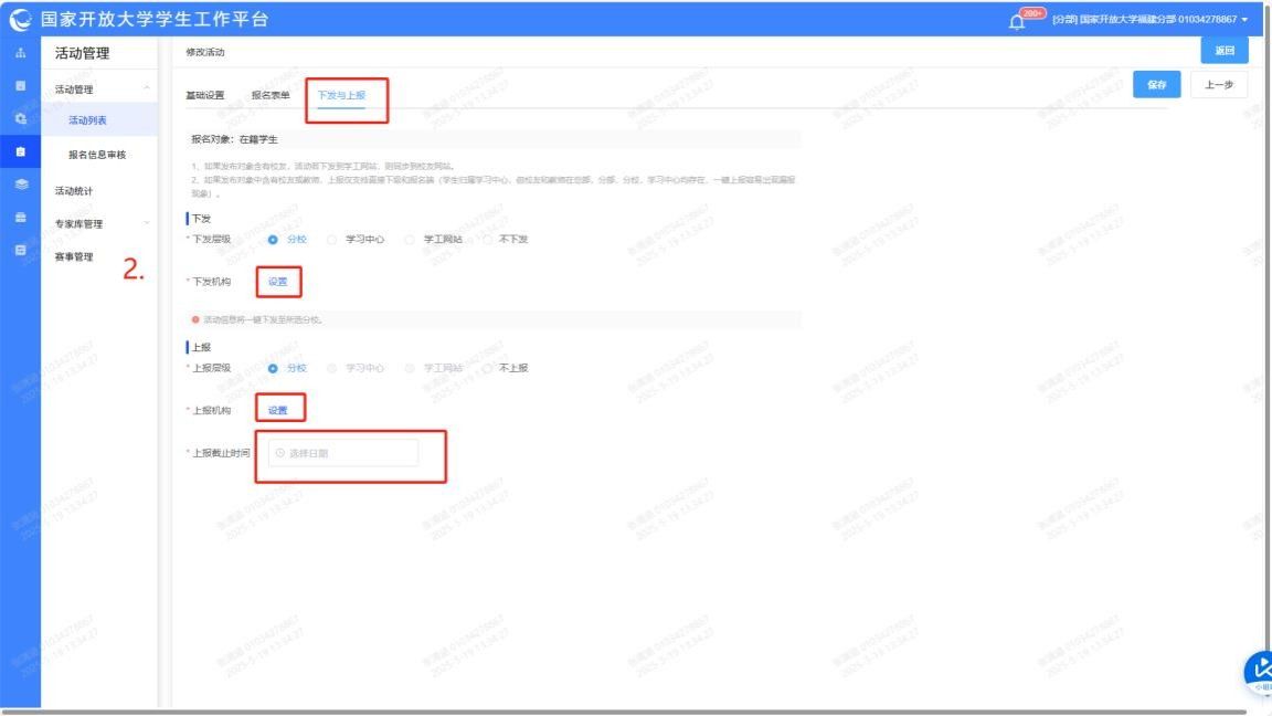4.选择下发和上报的机构,设定下一级上报截止时间。